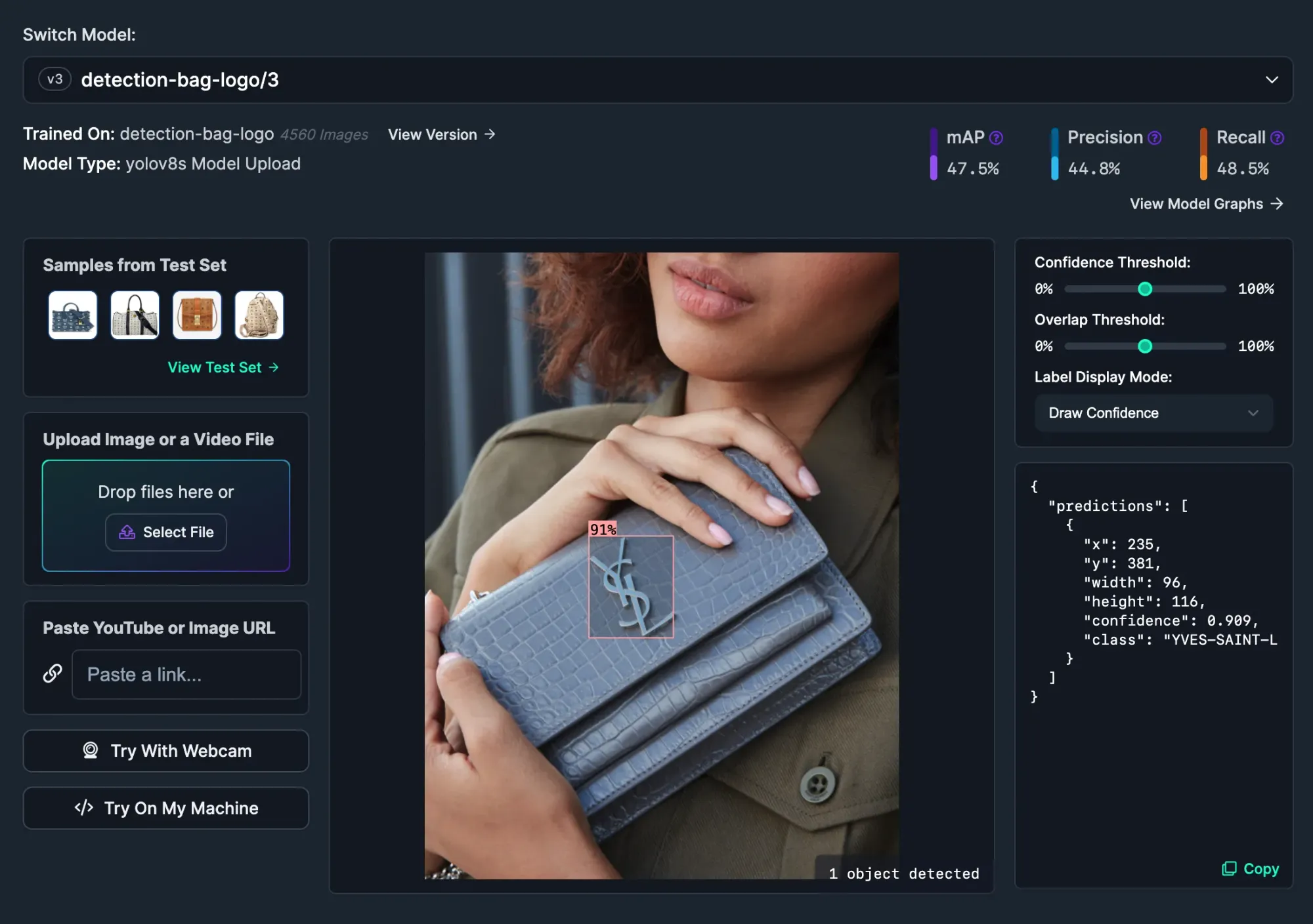 From this page, you can drag and drop an image on which to test the pre-trained model, or select a pre-loaded image from the model test dataset on the page: