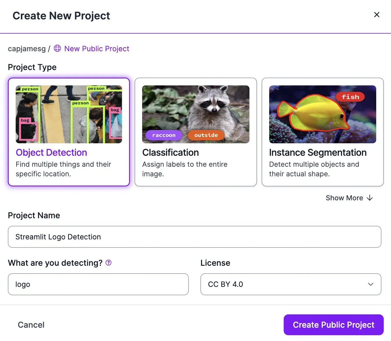 Sign up for a free Roboflow account, then create a new project in the Roboflow dashboard: