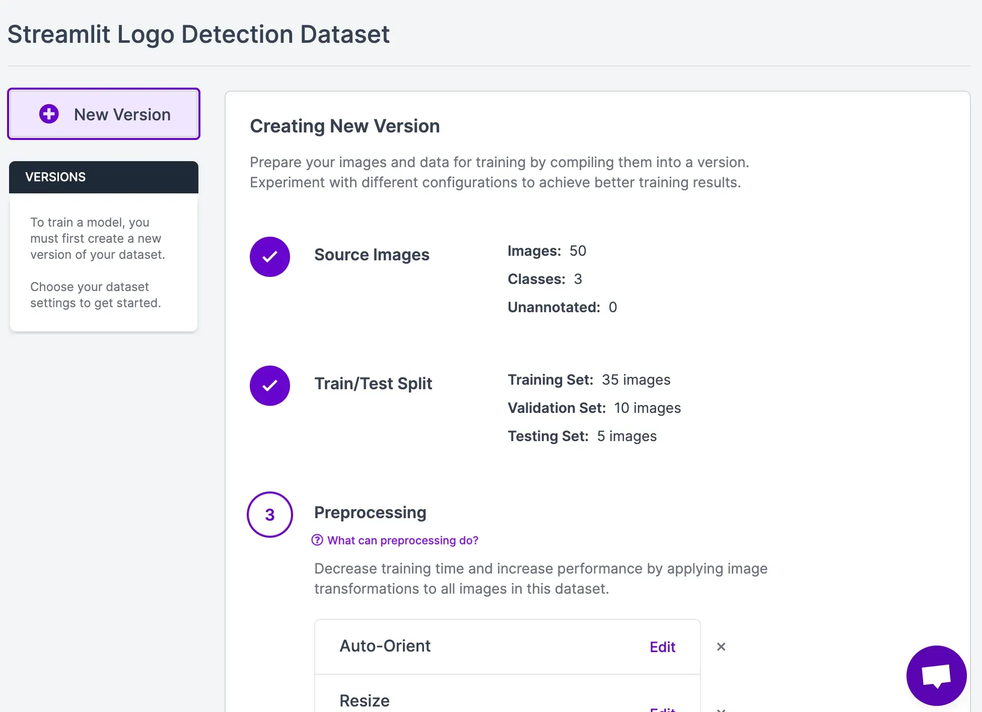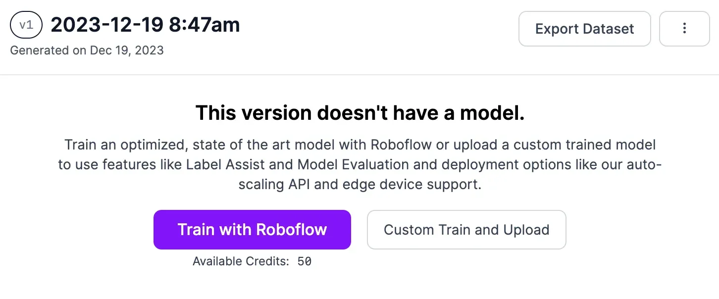 Once you have labeled all of your data, click “Generate” in the sidebar to generate a project version. A page will appear in which you can generate a dataset. This dataset will be used to train your model.
