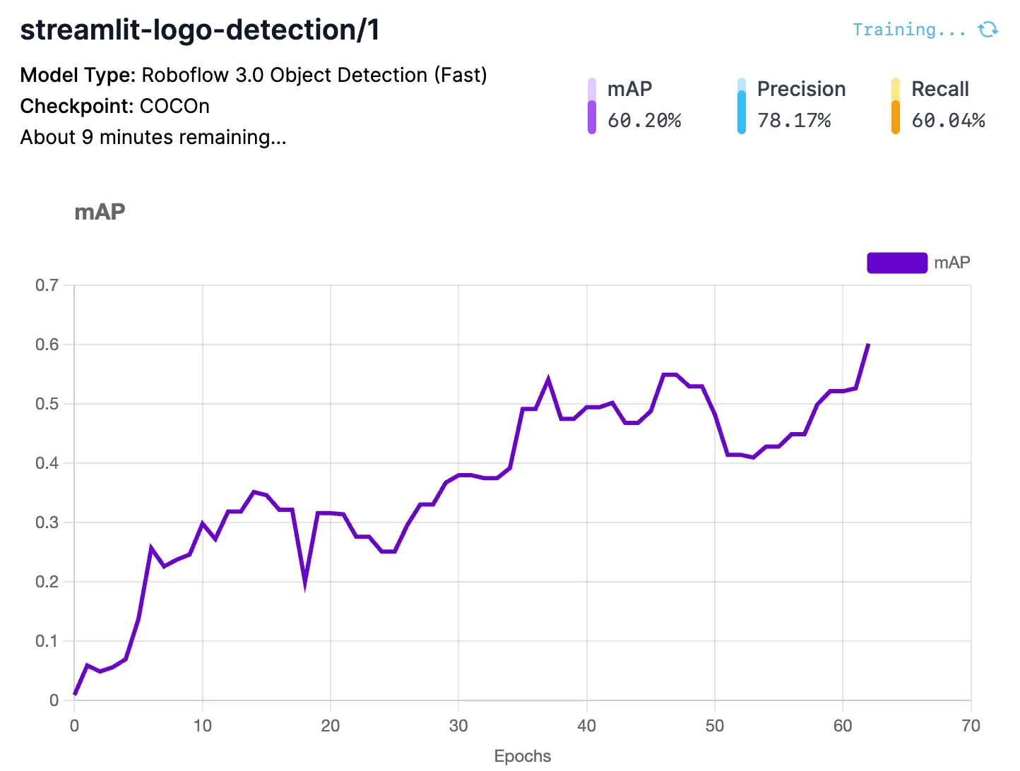 The main chart shows how your model Mean Average Precision (mAP) changes as your model trains. mAP is Mean Average Precision, a measure of model performance. In general, the higher the mAP number is, the better.
