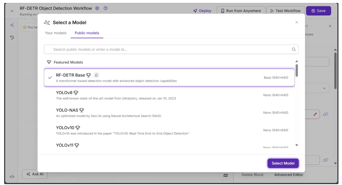 To add the block, click “Add a Model”, then select the “Public Models” option. This will display all the available object detection models on Roboflow; among them, click RF-DETR: