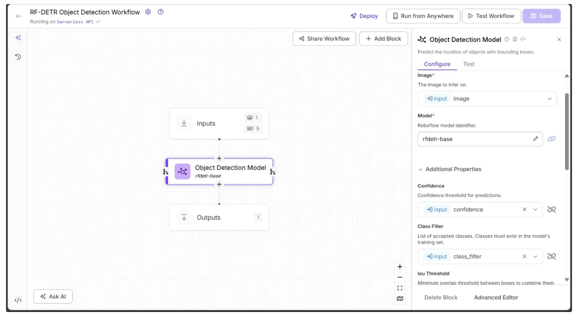 Next, we’ll add object detection capabilities to our workflow using the Object Detection Model block. This Roboflow workflow block allows us to utilize RF-DETR for object detection.