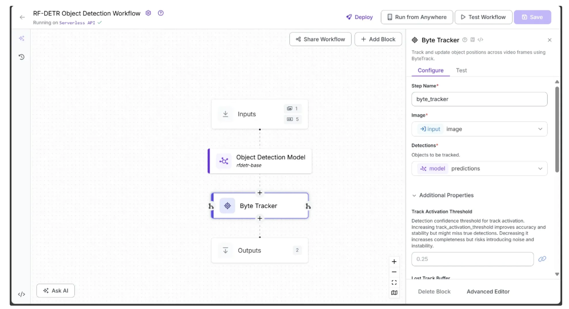 To enable tracking of objects across video frames using the predictions from the Object Detection Model, we add a Byte Tracker block to the workflow.