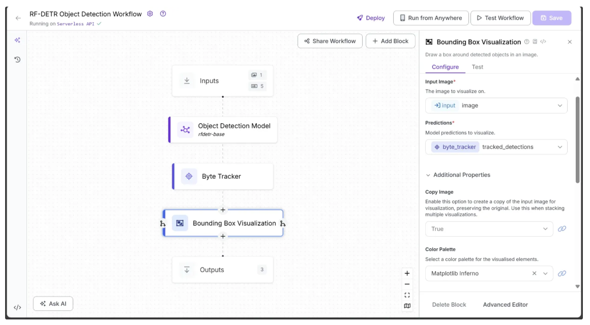 In the Configure tab, link Image to the image parameter from the Inputs block and Predictions to the tracked_detections output from the Byte Tracker block. Select a Color Palette for the bounding boxes; in this workflow, we used ‘Matplotlib Inferno’, as shown below:
