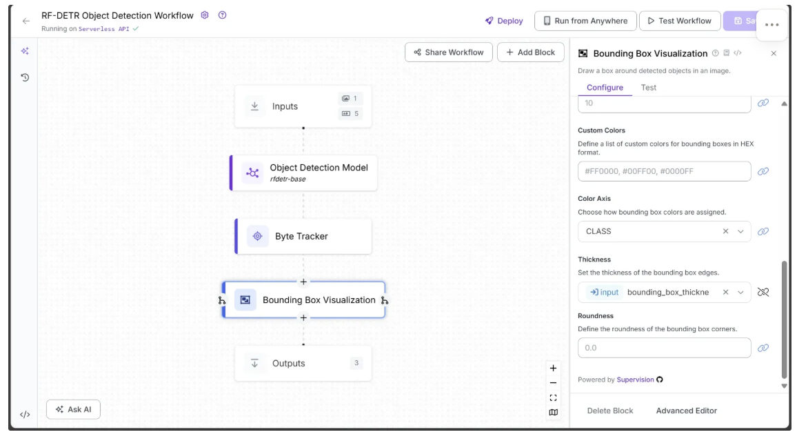 Roboflow Workflows allows us to seamlessly chain multiple computer vision tasks, such as object detection, bounding box visualization, and label visualization, among many others. Each task is represented as a built-in modular block, enabling us to visually design and customize workflows.