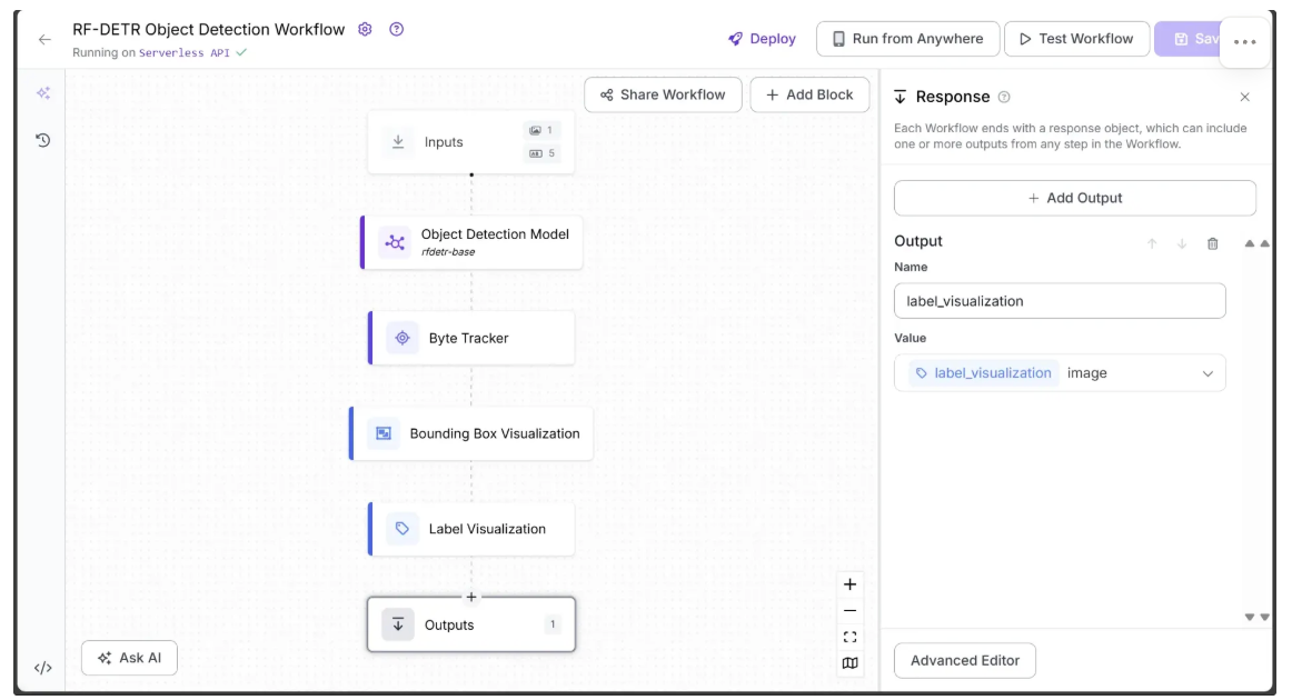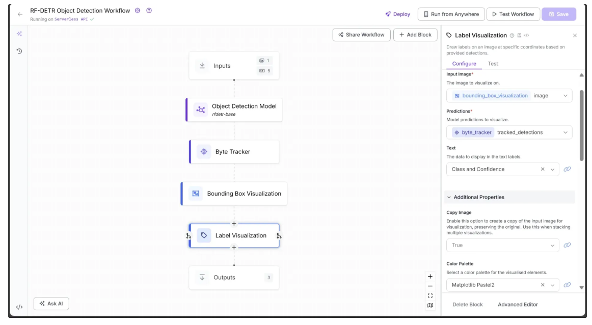 Ensure label_visualization is set as a workflow output and linked to the Label Visualization block’s image, which represents the final object detection result.
