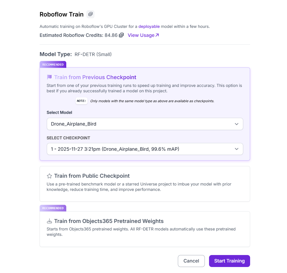 Roboflow also supports training from a previous checkpoint, allowing you to start from an earlier successful model instead of training from scratch. This speeds up convergence and improves accuracy when new data represents incremental changes rather than a completely new distribution.