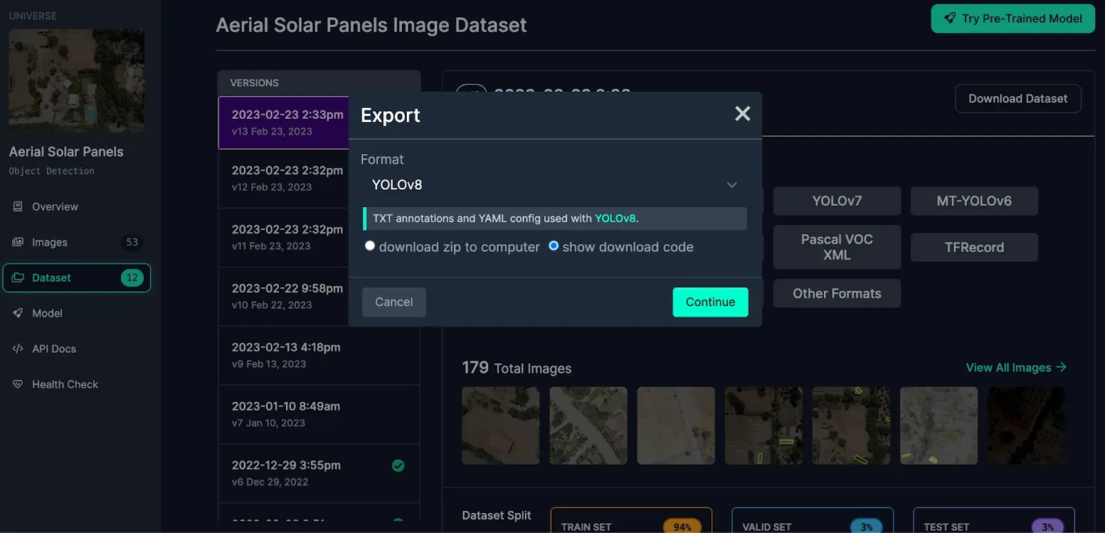 Select the YOLOv8 export format and select “download zip to computer”.