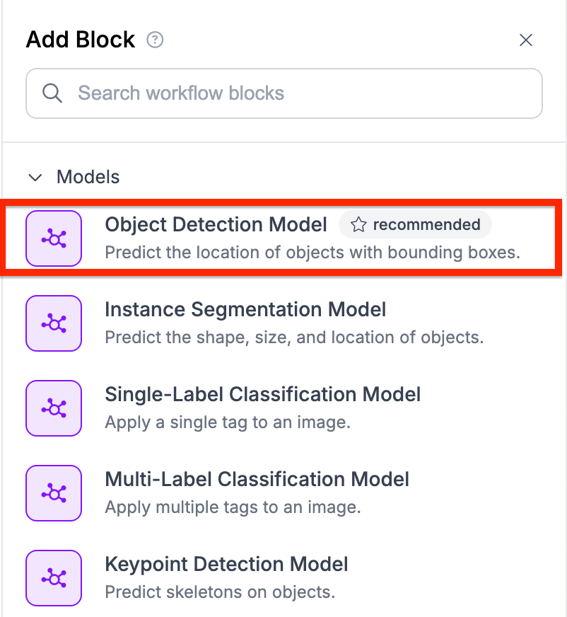 You will then be taken to the Workflows editor where you can configure your Workflow. From the Workflows editor, click “Add Block” in the top right corner and select the object detection model block from the sidebar: