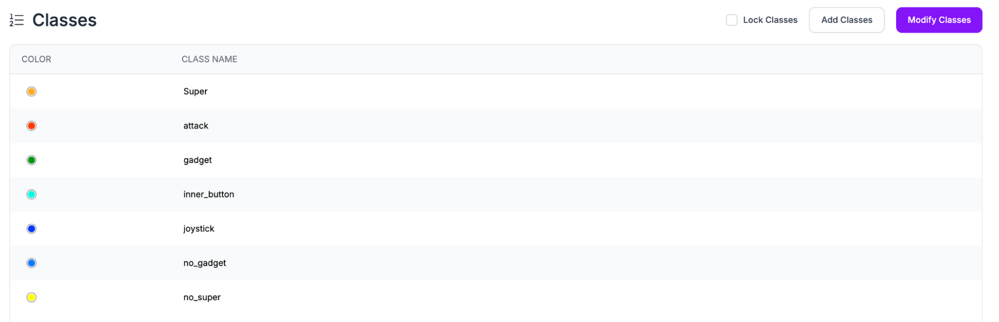 Then, add the classes you want your model to detect. Because we are mapping user inputs, we add 8 specific classes that the user can actually change within the game.