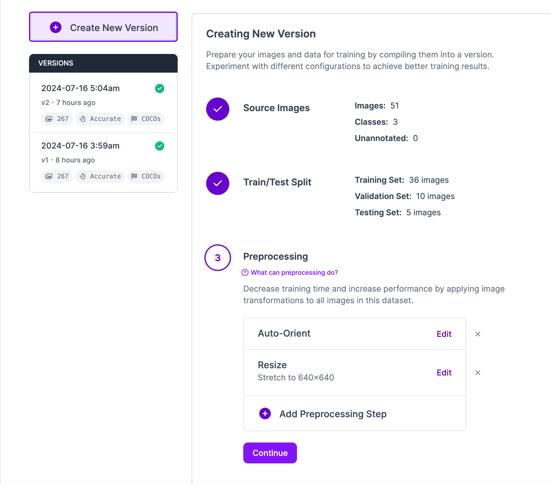 Finally, generate a dataset version of your labeled images. Each version is unique and associated with a trained model so you can iterate on augmentation and data experiments. To learn more about image preprocessing and augmentation, refer to our guide on image preprocessing and augmentation.