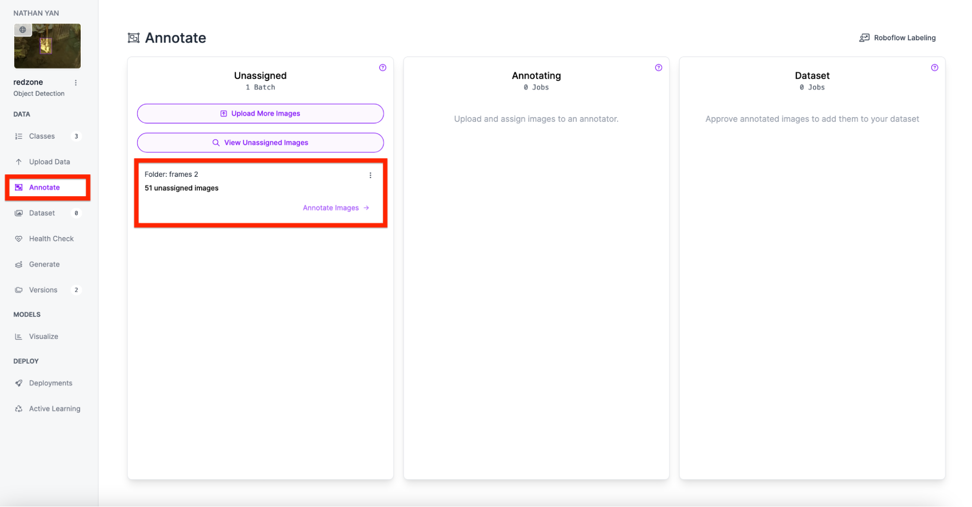 Next, start annotating your dataset. We recommend getting at least 50 annotated images before training your first model.