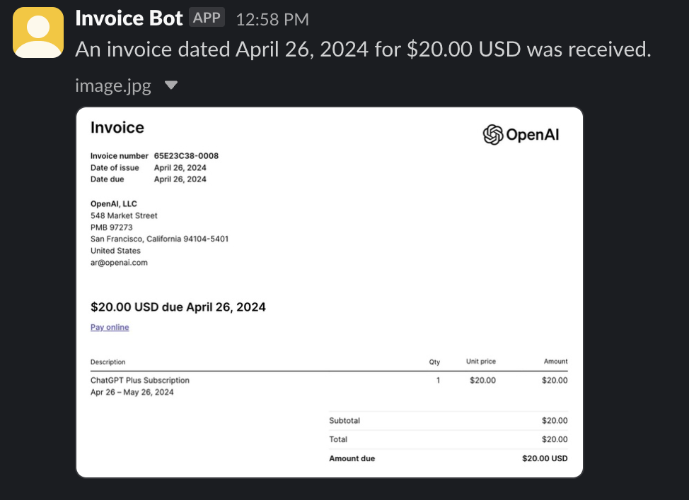 With our invoice reading system ready, we can start to build custom logic that uses the results from the invoice OCR step. For example, we can send a notification to Slack with the results from our system.