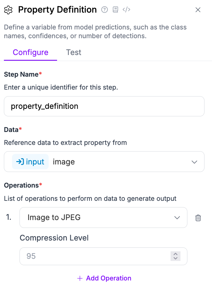 - Property Definition, which we will use to take our input image and convert it into a JPEG that can be sent to Slack.