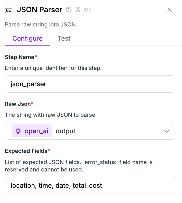Add a new JSON Parser block to your Workflow. Configure the Expected Fields value to be the keys that you defined in the OpenAI block earlier that you want to use in your Workflow.