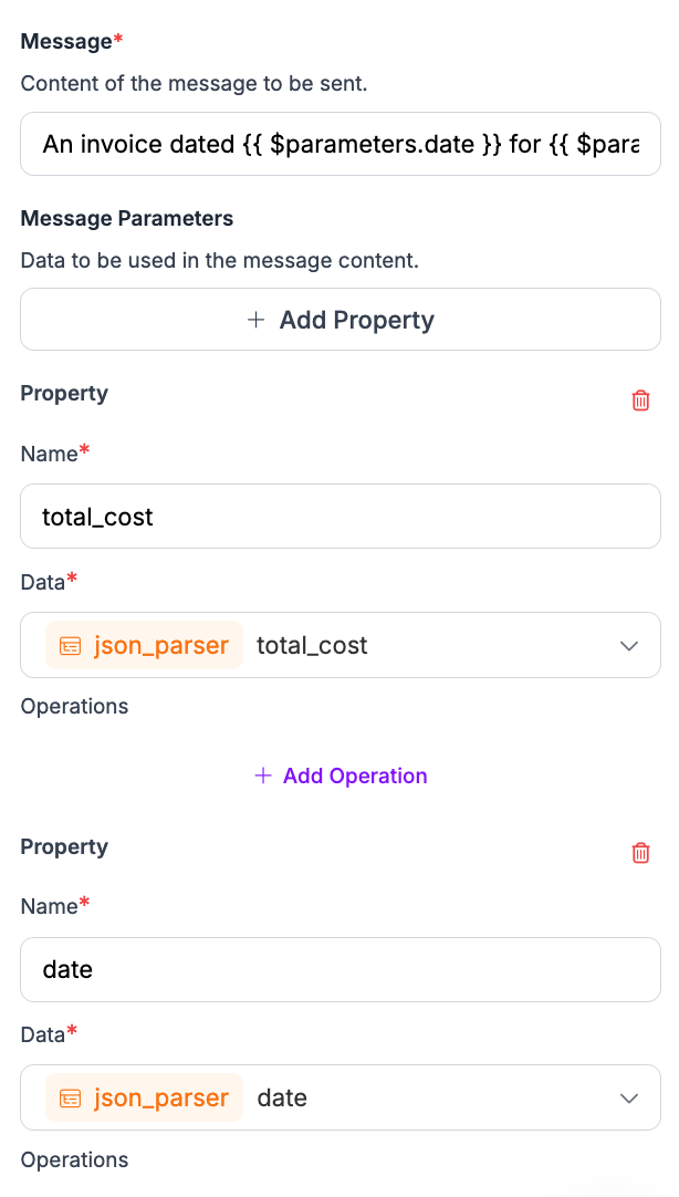 Finally, click "Add Property" and add properties for each value you want to be readable in the message, like this: