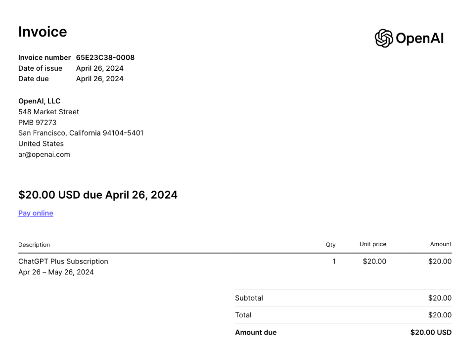 "output": "```json\n{\n \"sender_name\": \"OpenAI, LLC\",\n \"total_cost\": \"$20.00\",\n \"items_in_invoice\": \"ChatGPT Plus Subscription\",\n \"issuance_date\": \"April 26, 2024\",\n \"due_by\": \"April 26, 2024\"\n}\n```",