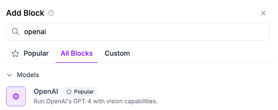 Click “Add Block” in the Workflows editor, then search for the multimodal you want to add: