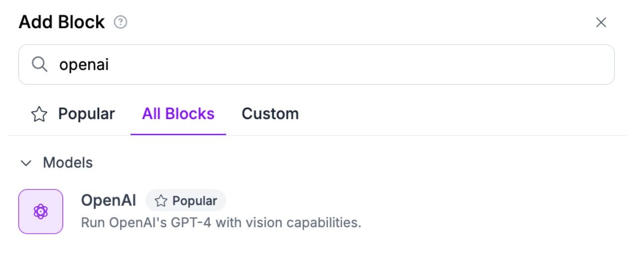 Click “Add Block” in the Workflows editor, then search for the multimodal model you want to add: