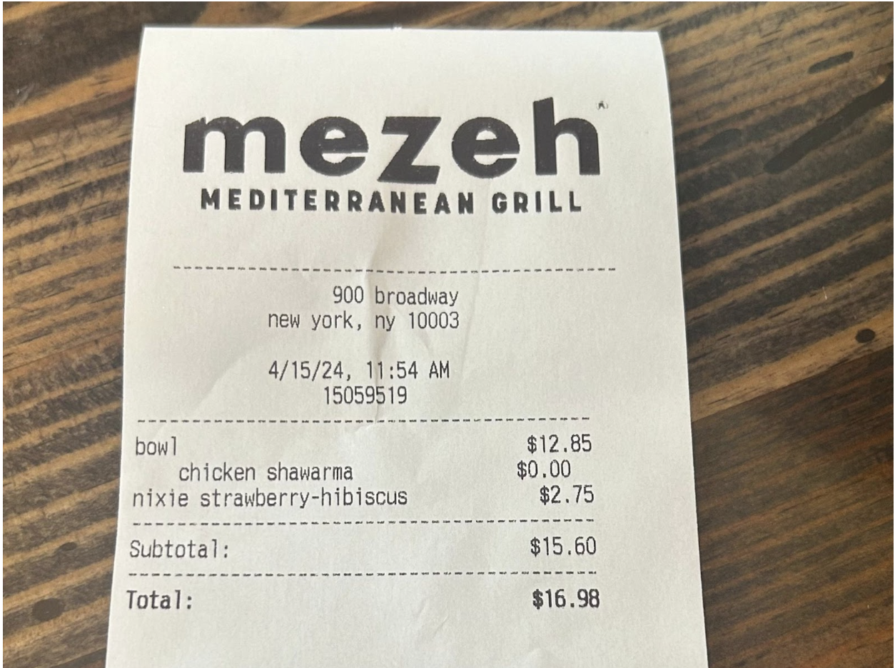 "output": "```json\n{\n \"location\": \"900 Broadway, New York, NY 10003\",\n \"time\": \"11:54 AM\",\n \"date\": \"4/15/24\",\n \"transactions\": [\n {\n \"item\": \"bowl chicken shawarma\",\n \"cost\": \"$12.85\"\n },\n {\n \"item\": \"nixie strawberry-hibiscus\",\n \"cost\": \"$2.75\"\n }\n ],\n \"total_cost\": \"$16.98\"\n}\n```",