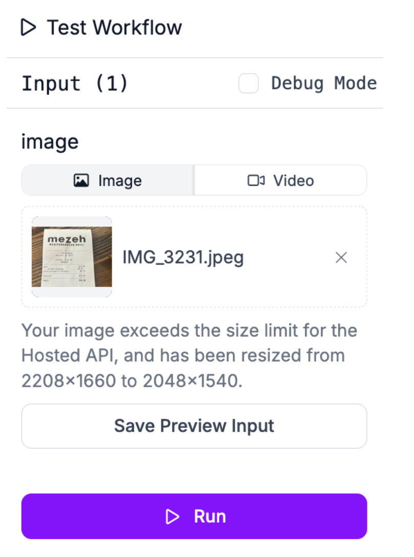 Click “Test Workflow” in the top right corner of the Workflows application, then drag and drop an image that you want to use: