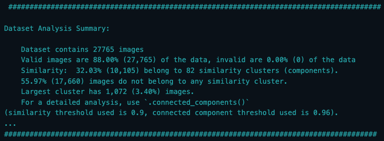 fd_valid.run()This will output a detailed analysis summary as shown below, providing information about the similarities within your dataset. You'll learn the total number of images, how many of those are considered valid, the percentage of similarity, the number and percentage of outliers, and more.