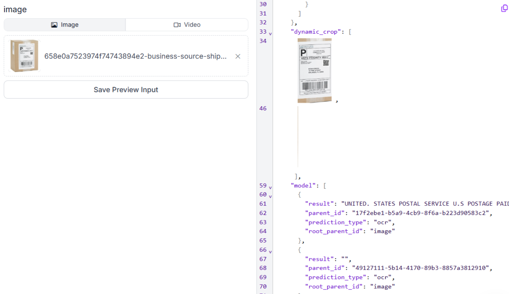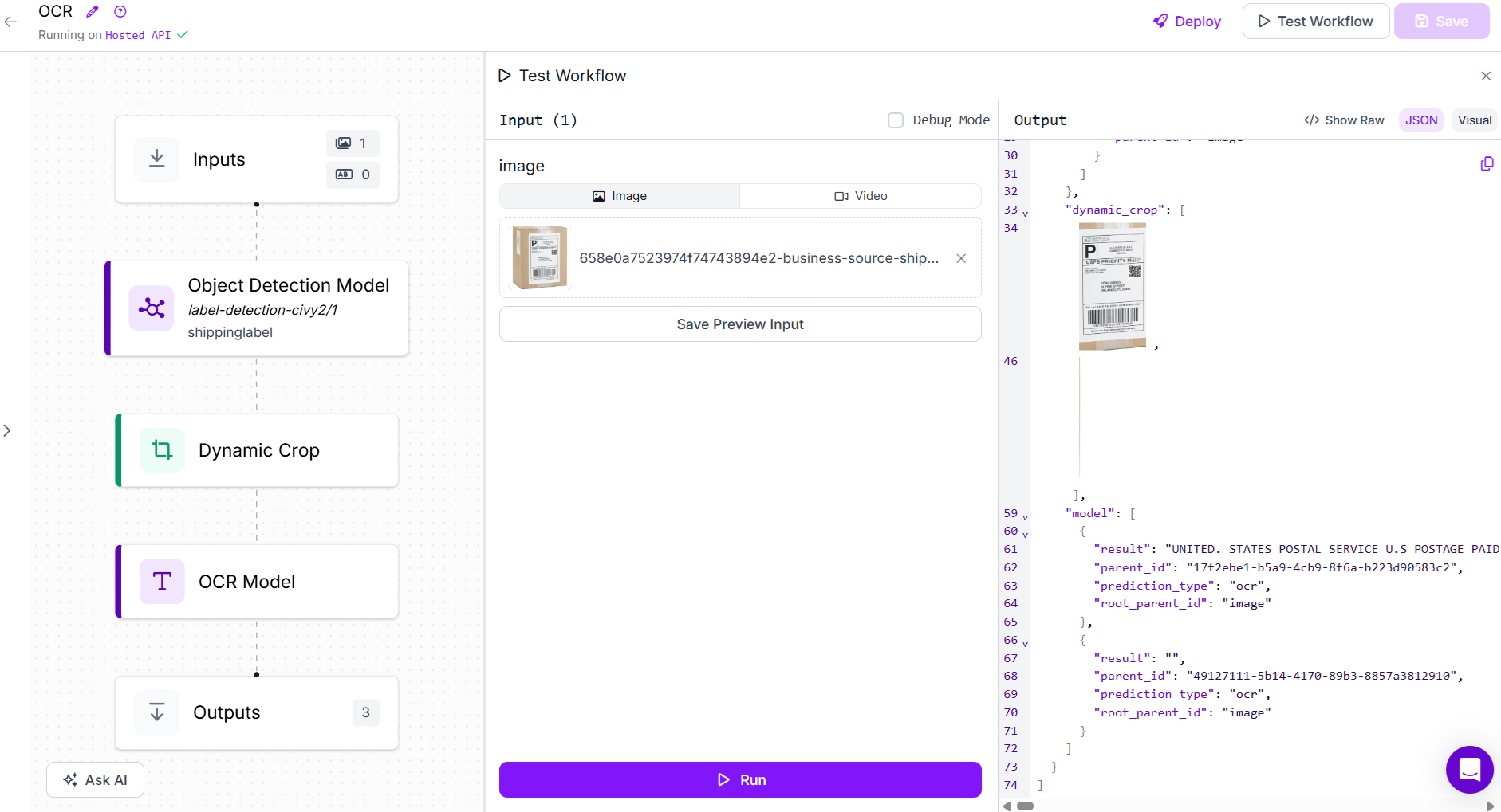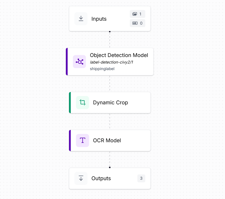 Documents or labels on pallets may contain any other information that need to be detected and processed. For example, list of items in the pallets. There are different techniques to extract OCR. Here we will make use of OCR model block in Roboflow workflow. The following is the workflow, almost similar to what we used in step 2.1 and 2.2 but with OCR Model block.