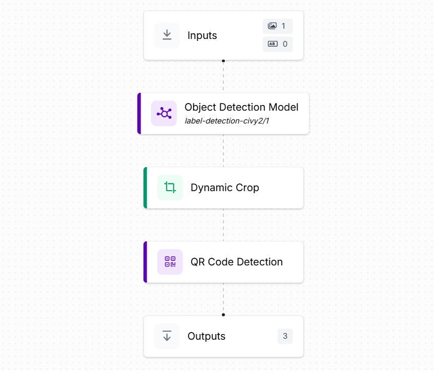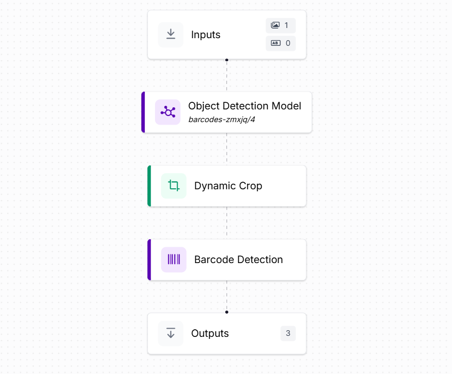 Create the workflow for detecting and reading barcode as following. The workflow has Object Detection Model block, Dynamic Crop block, Barcode detection block along with the input and output block.