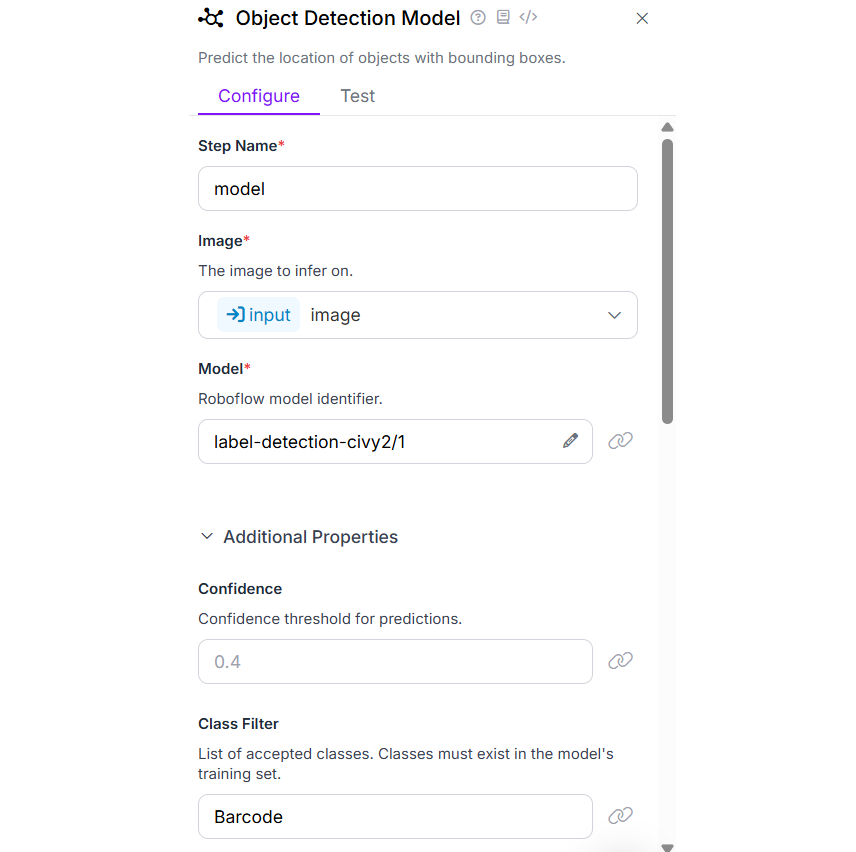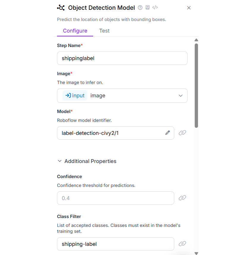In the object detection model block configuration for this workflow, I selected the model built in Step 1 and set the Class Filter property to detect only the shipping-label class. This allows the model to extract all relevant data except the QR code and Barcode.