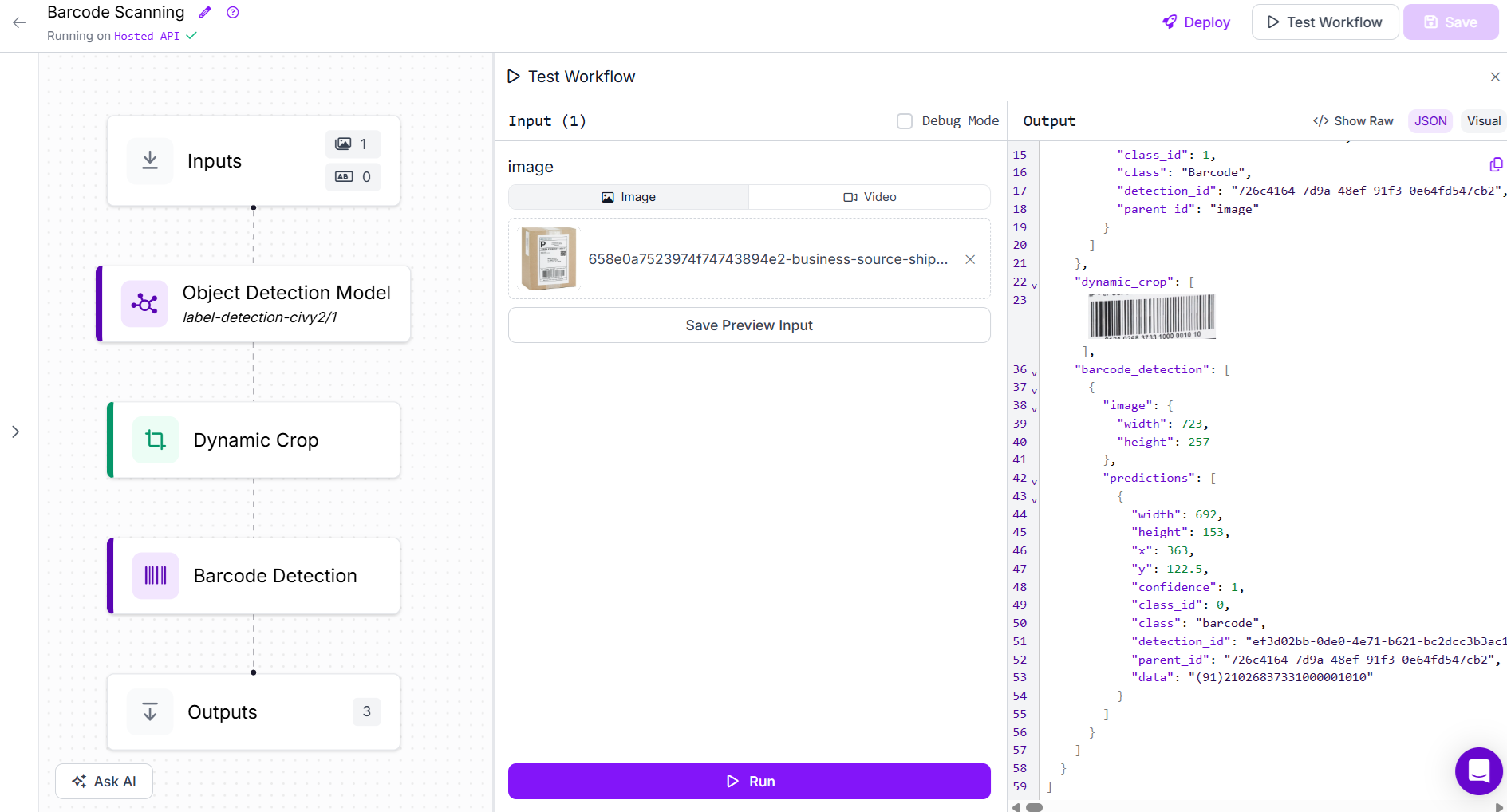 When you run the workflow and upload an image with a barcode, it will decode the barcode and return the information, which can then be utilized further. You will see the barcode data as follows: