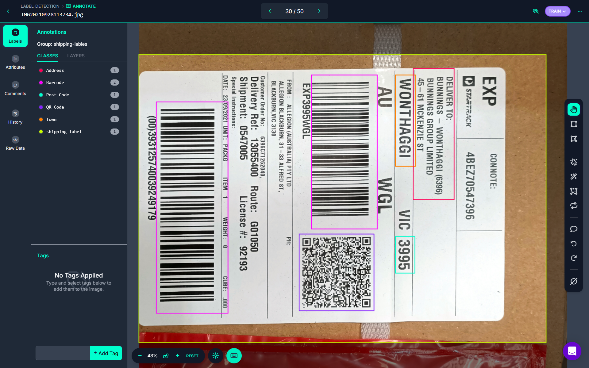First, train a computer vision model to detect the label, barcode, QR code or any other relevant information on the document on pallets. I build a computer vision model and label the dataset with following classes.