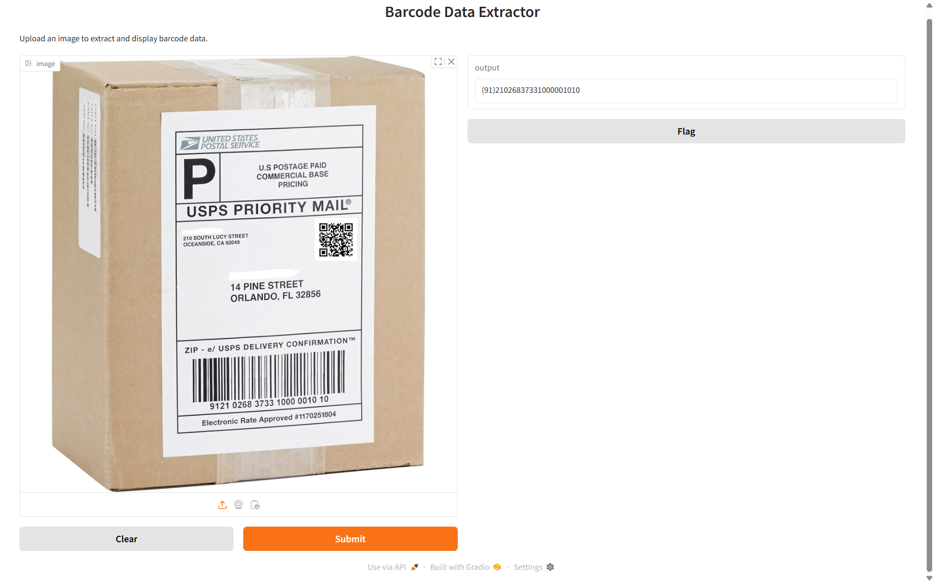 The above code code sets up a web application that allows users to upload an image and extract barcode data from it. When a user uploads an image, it is sent to a Roboflow workflow for processing. The workflow analyzes the image and returns a response containing detected objects, including barcodes. The code then extracts barcode data from the response and stores it in a list. If barcode data is found, it is displayed as text; otherwise, a message indicating that no barcode data was found is shown. You will see the following output when you run the code.