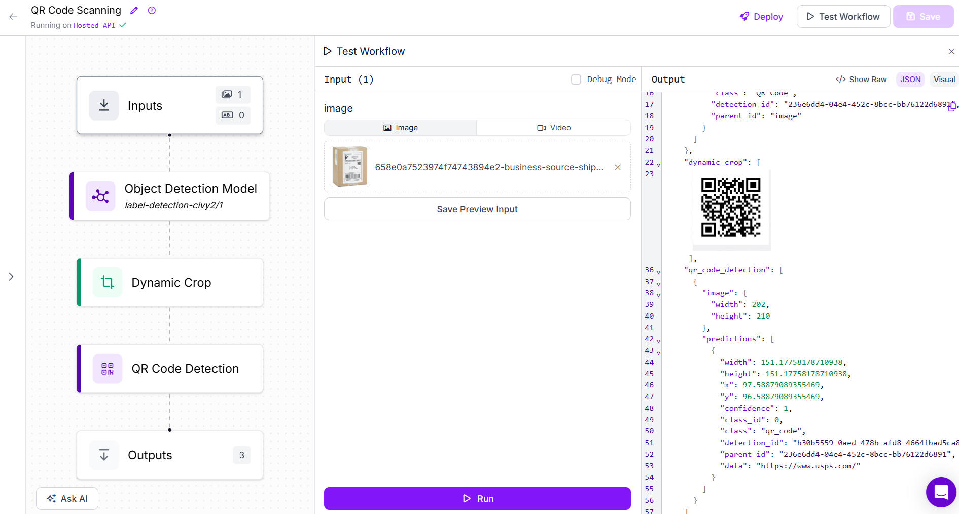 Running the workflow and uploading the image with QR code will generate output similar to following. It will return the QR code information as:
