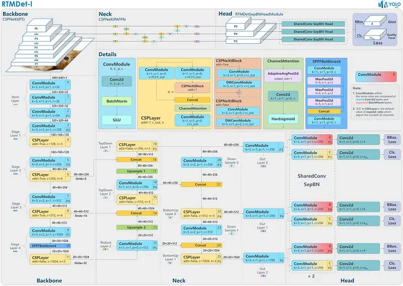RTMDet utilizes an architecture with compatible capacities in both the backbone and neck, constructed using a basic building block comprising large-kernel depth-wise convolutions. This design enhances the model’s ability to capture global context while maintaining fast inference speed.
