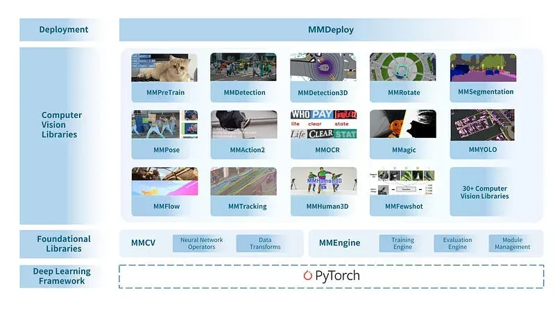 OpenMMLab covers a wide range of research topics of computer vision, such as classification, detection, segmentation, and super-resolution. A distinctive feature of this framework is that it is divided into many libraries of limited scope.