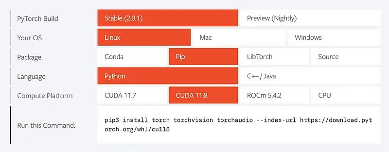 When installing PyTorch, make sure to choose a version that is suitable for your hardware and operating system. A tool on the official site will help you compose the right installation command.