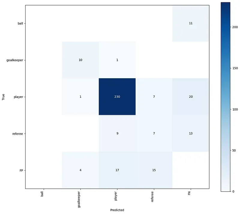 Just one look at the confusion matrix gives us a lot of information about our dataset and the model trained with it. Our data set is highly unbalanced — most annotations represent the player class. In contrast, our model does well with detecting goalkeepers and players, poorly with referees, and badly with the ball.