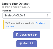Once you are satisfied with your labeled dataset you can create a dataset version by choosing preprocessing and augmentation options in Roboflow. After choosing a dataset version and hitting Generate, and Download choosing the Scaled-YOLOv4format - you will receive a curl link to bring into the Colab notebook.