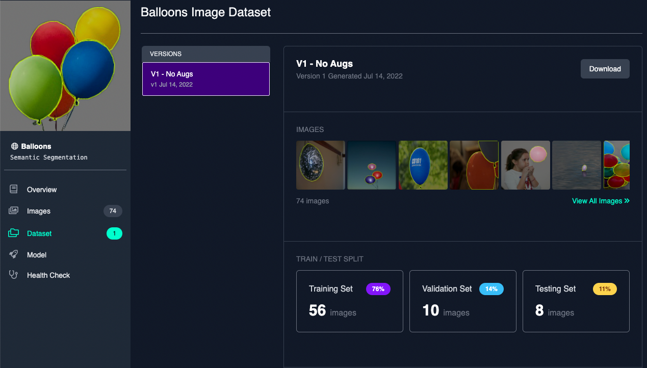 We use the public Balloons dataset for this tutorial but you can use any semantic segmentation dataset you can find on Roboflow Universe or upload and create your own dataset.