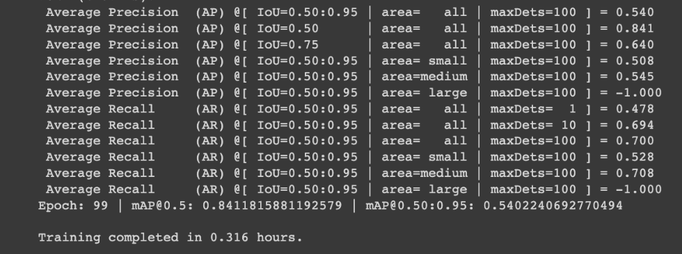 Note that we're adjusting the default epochs from 400 to 100. This is to expedite results. We're also adjusting the image size from the default 600x600 to 416x416. This is partially to increase training speed and also to keep in-line with prior YOLO family model norms (for easier head-to-head comparisons of performance).
