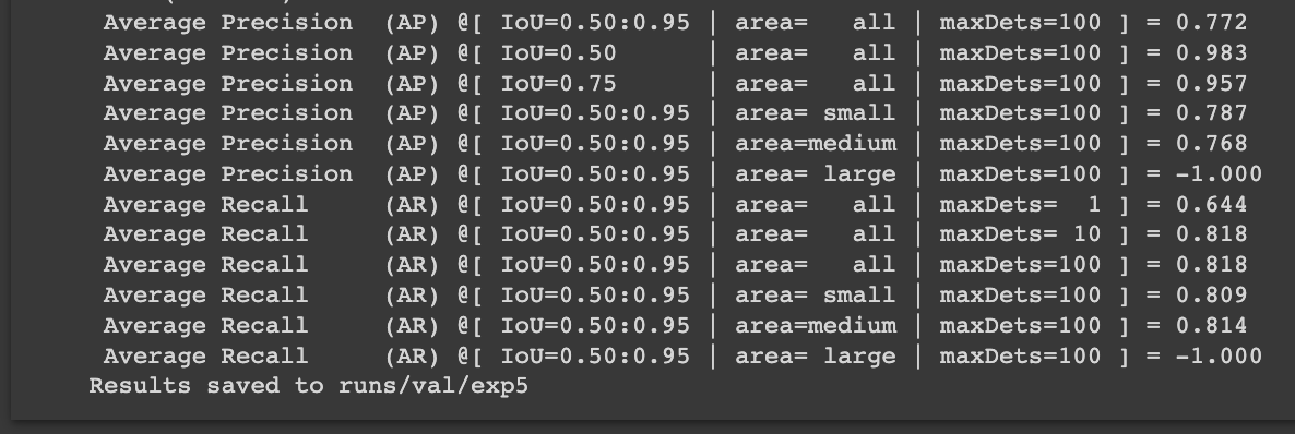Notably, we're grabbing our dataset's .yaml file from the right location (this ensures the model knows what images to run evaluation on), setting image size to 416 (as we did in training), and specifying which weights to use (the path here is the default path for where model training saved them.