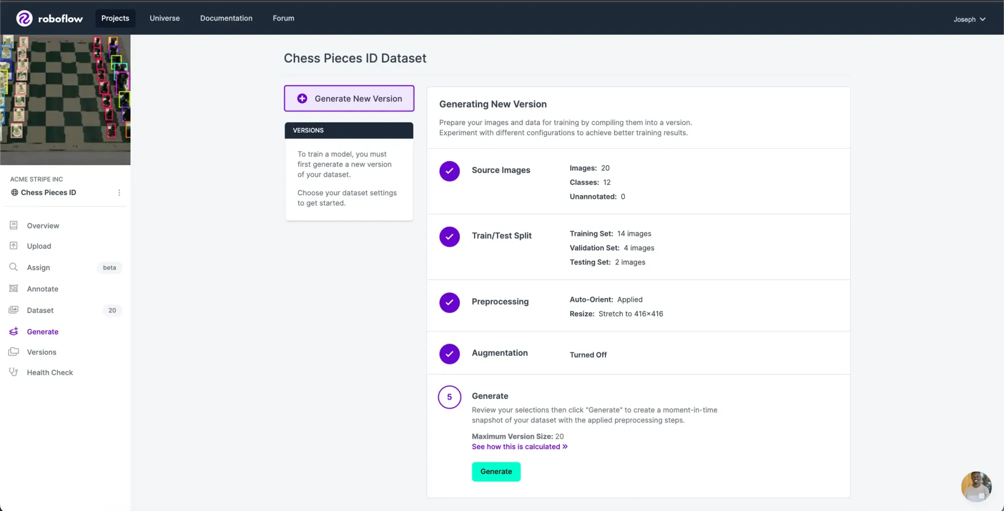 In our custom chess piece detection tutorial, our images already come with 2,870 annotations across 289 images (thanks, open source datasets!). You can jump to the next header section if you plan to proceed with this chess dataset, or use any of the thousands of object detection datasets that are open source computer vision datasets from Roboflow Universe.