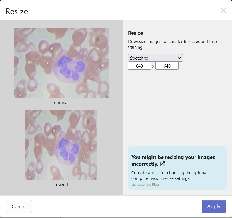 After forking the dataset, you will want to add one preprocessing step which would be to resize all of the images to a size of 640 x 640: