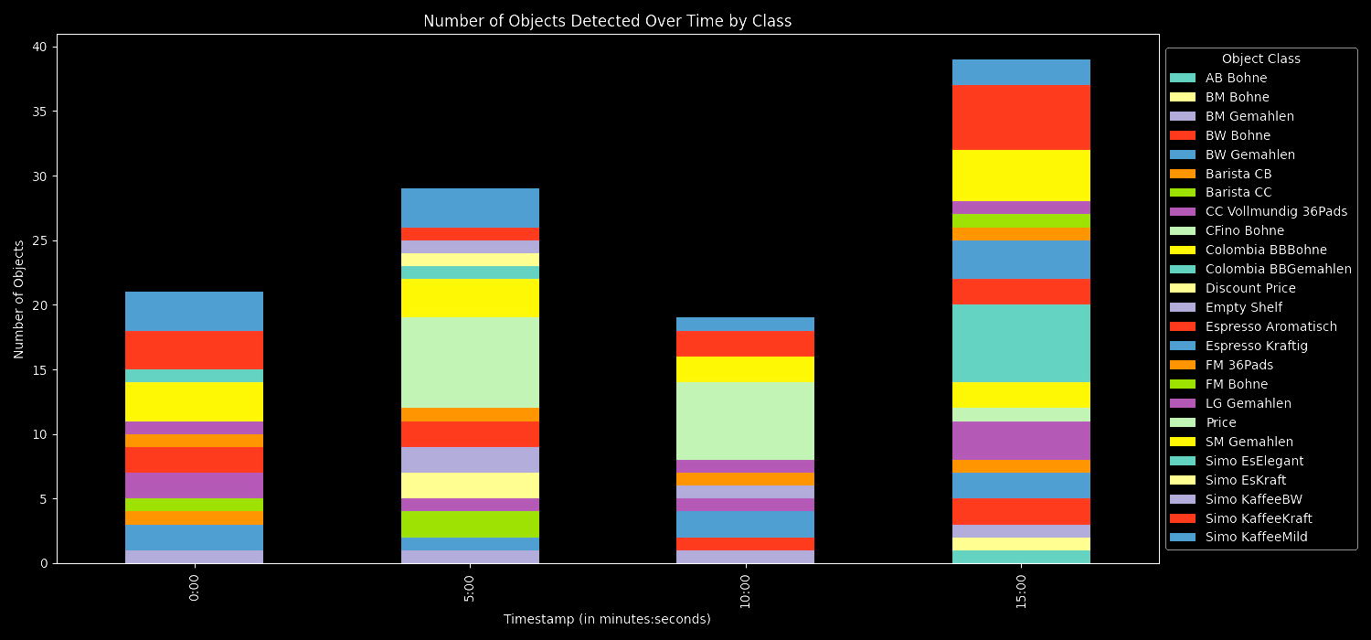 predictions.csv: Holds specifics of every object detected, like where it's located, its size, and its type.object_counts_per_interval.csv: Gives a sum of all objects picked up within set time frames.object_counts_by_class_per_interval.csv: Lists how often each kind of object appears within those time frames.- Bar Charts: These graphs illustrate object detections over the video's duration, both as a total count and by individual object types.
