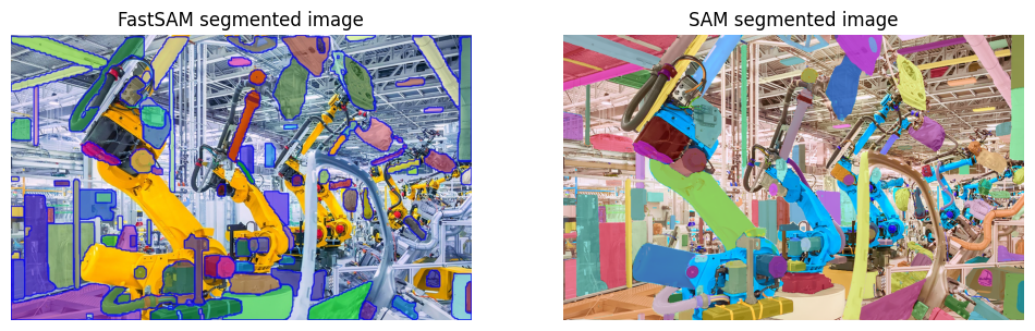 The code below compares the segmentation masks generated by FastSAM and SAM. The FastSAM output image and the annotated image with SAM masks are displayed side by side for visual comparison.