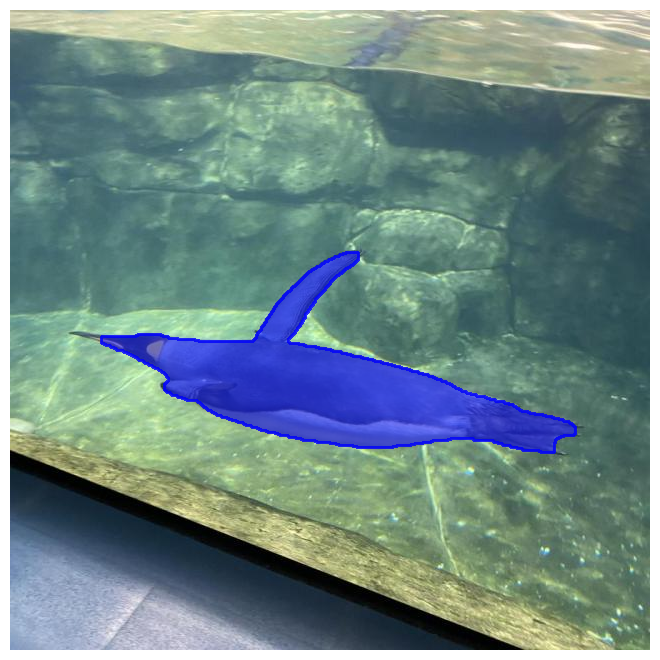 prompt_process.plot(annotations=ann, output='./output/')The code snippet above loads an image from the Roboflow dataset and applies FastSAM with the text prompt "Penguin". The resulting segmentation mask is visualized and saved as an output image.