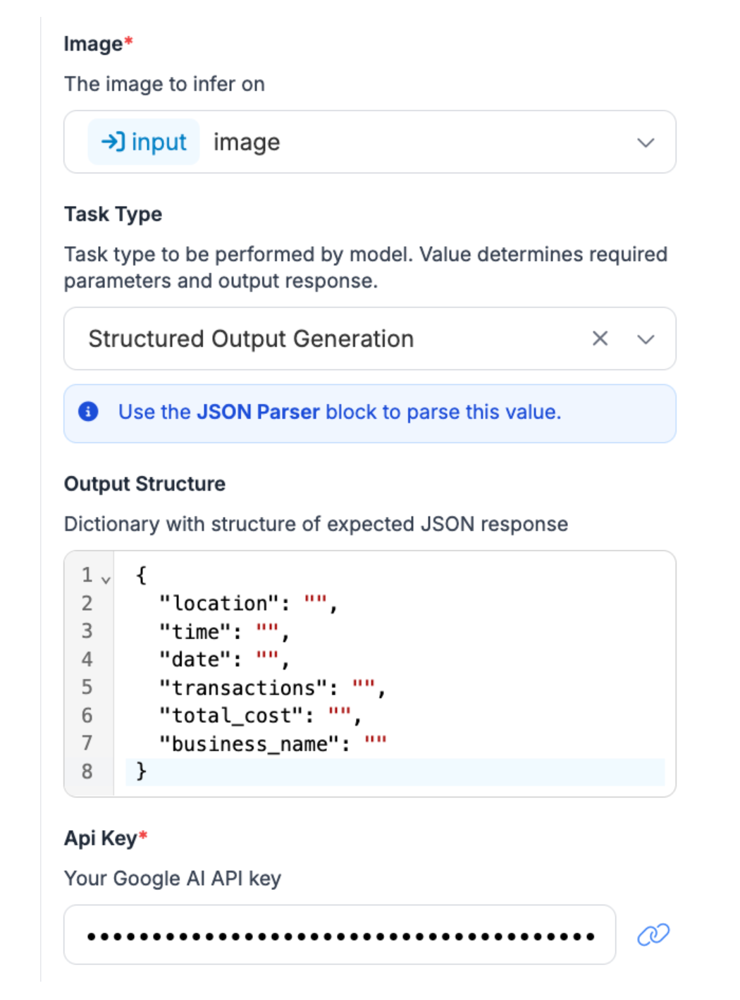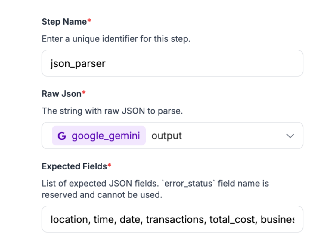 Add a new JSON Parser block to your Workflow. Configure the Expected Fields value to be the keys that you defined in the Gemini block earlier that you want to use in your Workflow.