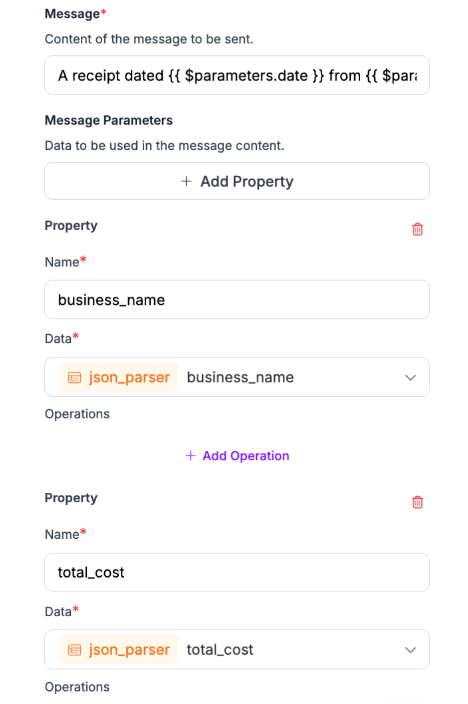 A receipt dated {{ $parameters.date }} from {{ $parameters.business_name }} was received. {{ $parameters.total_cost }} was spent.This is the template for the message to send to Slack.