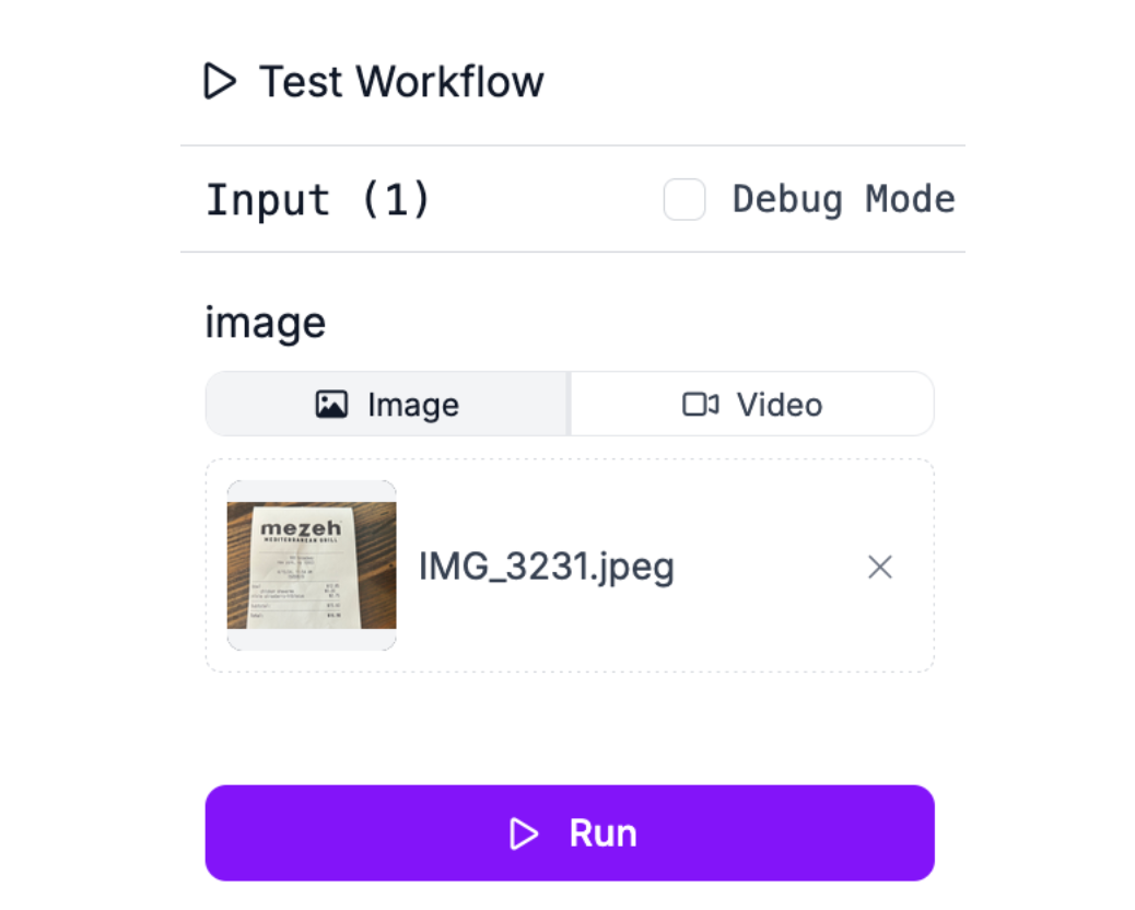Click “Test Workflow” in the top right corner of the Workflows application, then drag and drop an image that you want to use: