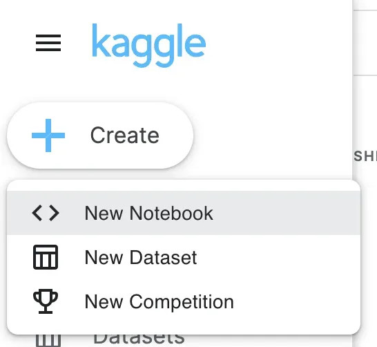 To upload a dataset into Kaggle, click the Create Dataset button under the Create button.